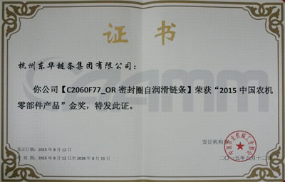 會上,與會人員主要圍繞會議主題進(jìn)行技術(shù)、市場、創(chuàng)新、發(fā)展等廣泛交流。會議期間,評比并頒發(fā)了2015中國農(nóng)機(jī)零部件46項(xiàng)金獎產(chǎn)品和25項(xiàng)創(chuàng)新獎產(chǎn)品。東華申報的C2060F77_OR和C2062H_ORSDF1密封圈鏈條經(jīng)久保田、福田雷沃等知名整機(jī)企業(yè)的推薦,專家委員會最終評審決定,對   東華申報的這兩款密封圈鏈條分別授予金獎和創(chuàng)新獎。這個獎項(xiàng)是目前農(nóng)機(jī)鏈條企業(yè)的最高榮譽(yù),體現(xiàn)了東華農(nóng)機(jī)鏈條處于國內(nèi)同行領(lǐng)先水平,得到廣大農(nóng)業(yè)主機(jī)單位的贊譽(yù)和認(rèn)可。東華生產(chǎn)的農(nóng)機(jī)鏈條也暢銷國際市場,與CLASS、紐荷蘭等世界500強(qiáng)企業(yè)配套。