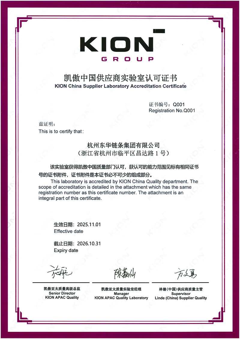 近日,東華鏈條成功通過(guò)凱傲集團(tuán)中國(guó)供應(yīng)商實(shí)驗(yàn)室審核認(rèn)可,并榮獲證書(shū)(編號(hào):Q001),成為凱傲集團(tuán)本年度首家通過(guò)該項(xiàng)審核的供應(yīng)商。
